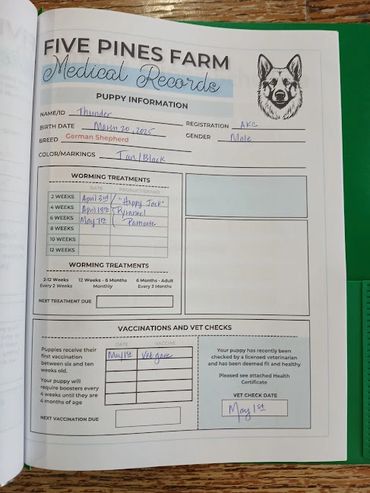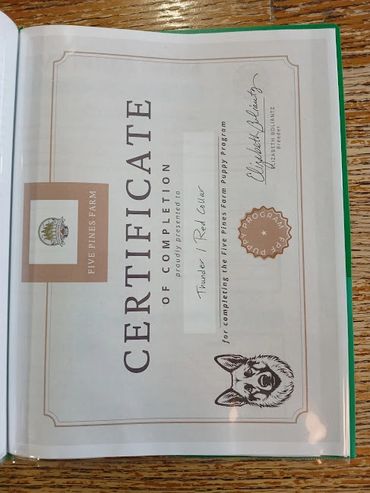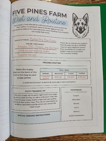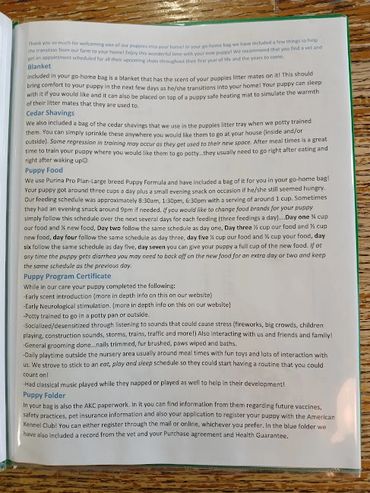 At Five Pines Farm, we understand the importance of sending your Fur Baby home with some essentials like food and Vet Records. We will also include a folder with AKC paperwork, Information about your puppy's routine, diet and medical records! You will also go home with a blanket that smells like the litter and mom, cedar shavings we use in the potty trays, Information on our puppy program we completed with your puppy as well as a certificate of completion! We know you can't wait to take home your sweetie! We will continue to love and care for them until go-home day!